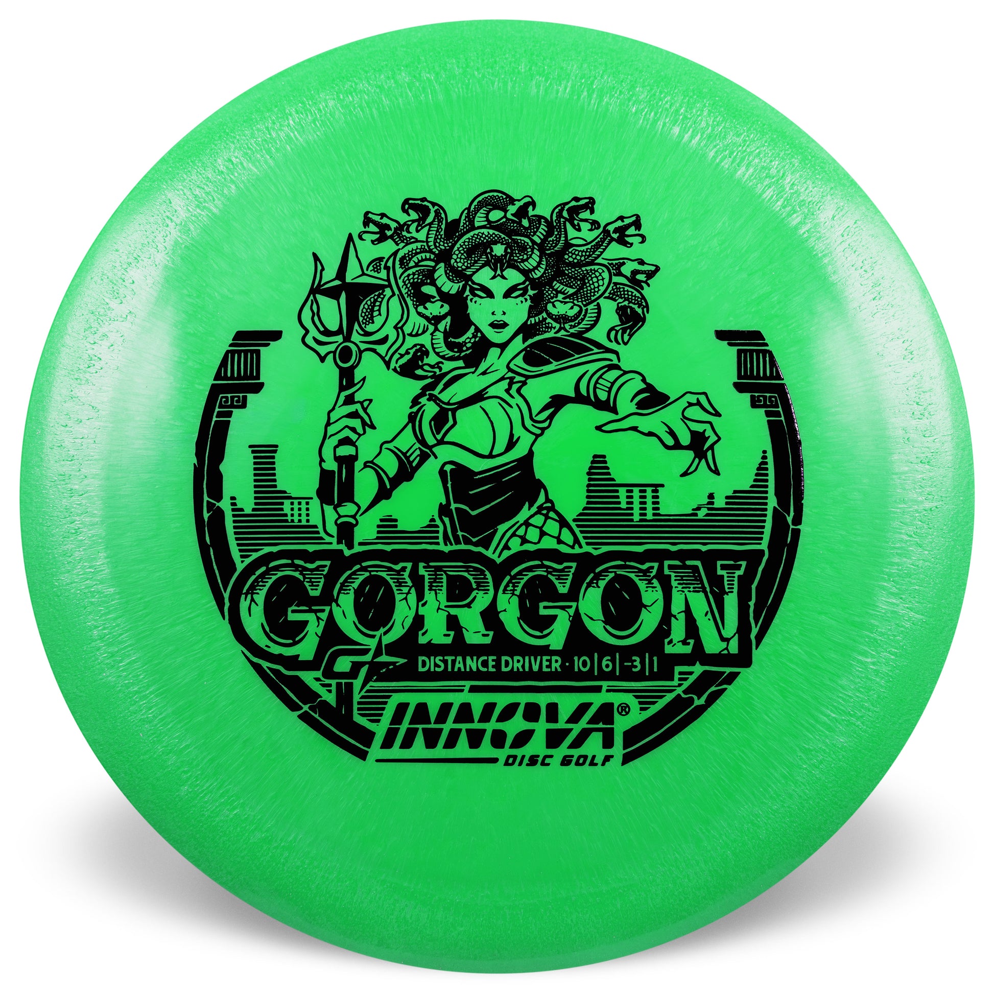 The Gorgon, a disc that merges the feel, precision, and ease of a Fairway Driver with the reach of a Distance Driver. Its flight: arrow-straight glide with a steadfast fade, mirroring the Gorgon's unwavering gaze. Experience the legend—drive like a deity, conquer the course.